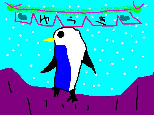 この絵は、真ん中の娘が書いた物です。見ての通り、ペンギンが後ろを振り向いて、何かを見ているのか、呼ばれたのかしたのでしょう。雪が降っているのは、雪へのあこがれもあるようです。
